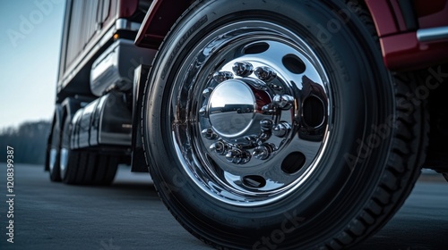 A detailed view of a truck tire on the road, suitable for use in industrial or transportation-related contexts