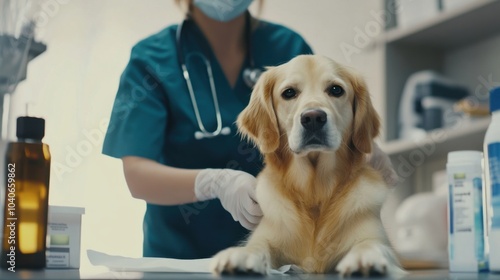 A detailed view of a veterinarian performing a check-up on a pet dog in a modern veterinary clinic, with medical equipment and pet care products visible, Veterinary style