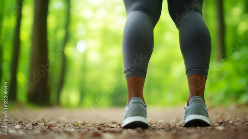 A detailed view of athletic legs in gray pants walking along a forest trail. The lush, green forest adds a peaceful touch to the setting, symbolizing fitness and nature's tranquility.