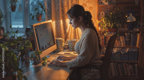 student, woman, determined, focused, computer, screen, dimly, lit, eclectic, home, office, young, adult, female, concentration, intensity, dedication, motivation, inspiration, education, learning, study, research, work, productivity, efficiency, effectiveness, goal, oriented, ambitious, driven, passionate, enthusiastic, interested, engaged, absorbed, immersed, intent, serious, solemn, quiet, peaceful, calm, serene, cosy, comfortable, relaxed, informal, casual attire