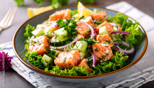 a, diced, salmon, dice, salad, new, modern, closeup, trend, avocado, food, meal, meat, dill, dinner, vegetable, plate, dish, cookery, healthy, lunch, cucumber, cucumber, vegetable, tomatoes, epicure, fish, fresh, fried, green, cooked, delicious, pepper, onion, macro, seafood, white, red, onion, advertisement, cook, book, parsley
