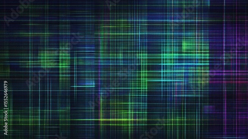 A digital abstract design with glowing neon lines and grids, reflecting futuristic technology in cool shades of blue, green, and purple, on a dark background
