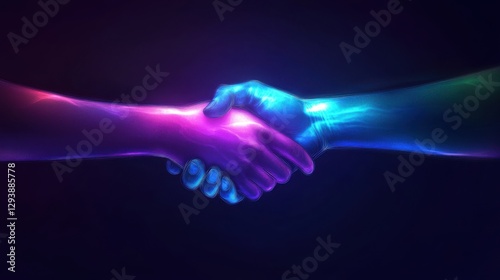 handshake, hand, colourful, neon, light, digital artwork, futuristic, vibrant, abstract, connection, partnership, teamwork, oneness, diversity, technology, energy, communication, friendship, collaboration, design, interaction, glowing, bright, artistic, modern, silhouette, innovation, harmony, visual, creativity, aesthetic, background, contrast, depth, texture, motion, flow, spirited, illustration, captivating, striking, expression, beauty, symbolic, metaphoric, concept, gesture