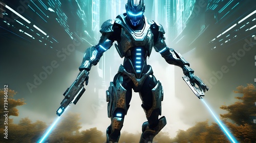 A digital avatar representing a hacker, clad in cybernetic armor and wielding virtual weapons in a virtual landscape.