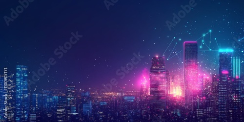 A digital cityscape at night with glowing data streams flowing between buildings