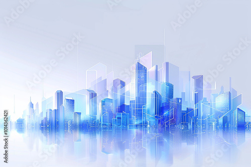 A digital cityscape featuring sleek blue and white gradient skyscrapers linked by glowing geometric patterns, representing futuristic technology. Ideal for branding, presentations, and web design