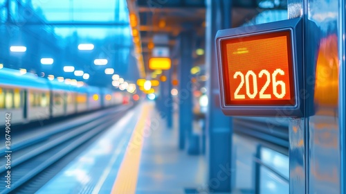 A digital display shows the year "2026" at a train station, with blurred trains and illuminated signs in a modern, urban setting.