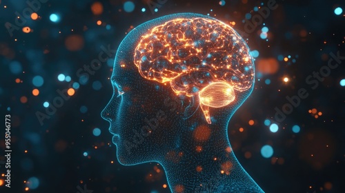 A digital human head with a glowing brain, symbolizing the concept of innovation, intelligence, and technology