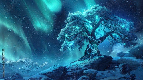 A digital illustration of a mystical ice tree in a fantasy landscape, with glowing runes etched into the icy bark.
