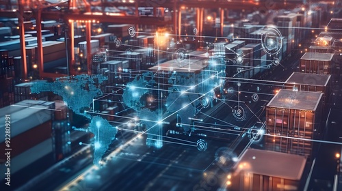 A digital interface showing global supply chain tracking, with multiple points connected by lines and data visualizations, symbolizing the integration of technology in managing complex logistics netwo
