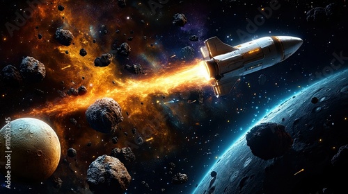 A digital rendering of a sci-fi spacecraft zooming past colorful alien planets and asteroid fields, showcasing the boundless possibilities of space exploration