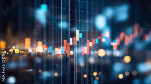 A digital representation of stock market trends with candlestick charts and blurred city lights.