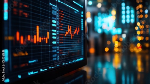 A digital screen displaying financial data with charts and graphs in a blurred background.