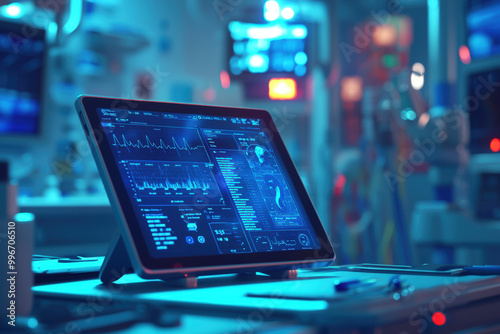 A digital tablet displaying patient EHR data in modern medical environment, showcasing vital signs and health metrics. blue lighting creates high tech atmosphere, emphasizing importance of technology
