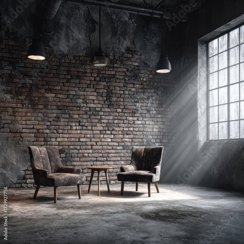room, industrial, brick, wall, furniture, chair, window, light, sun, interior, dark, concrete, design, vintage, aged, loft, moody, sunbeam, space, modern, cosy, table, sunlit, rustic, retro, darkroom, distressed, beautiful, colourful, bright, creative, elegant, stylish, professional, decorative, vibrant, stunning, amazing, marvellously, fantastic, gorgeous