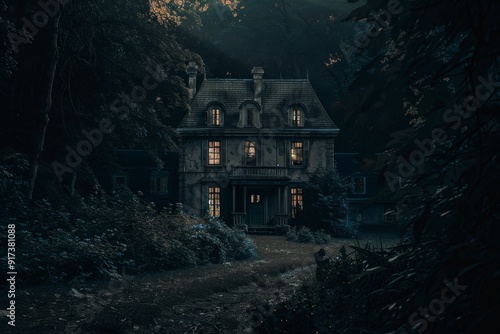 A dimly lit, old mansion stands eerily amid thick woodland, with faint light gleaming from the windows, evoking a sense of mystery and suspense.