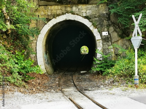 A dimly lit railway tunnel nestled in lush greenery invites exploration during the day in a remote area