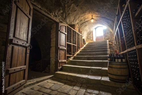 wine cellar, stone wall, low light, cellar, underground, storage, wine tasting, vinification, winery, vintage, rustic, old, antique, traditional, architecture, interior design, home decor, dark, moody, mysterious, romantic, elegant, sophisticated, luxury, epicure, beverage, alcohol, drink, red wine, white wine, barrel, stair, step, doorway, wooden door, stone floor, cobbled