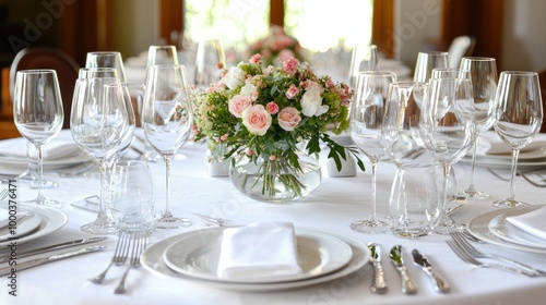 A dinner table set for a meal, with plates, silverware, wine glasses, and a centerpiece of flowers in the middle