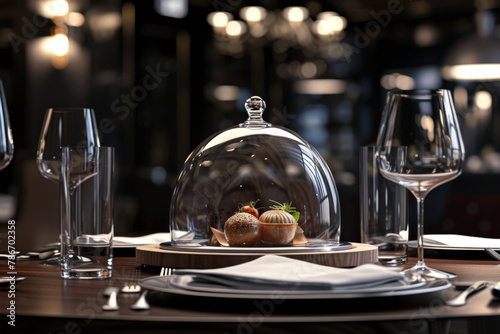 A dish in a restaurant covered with a glass cover with glasses on the table