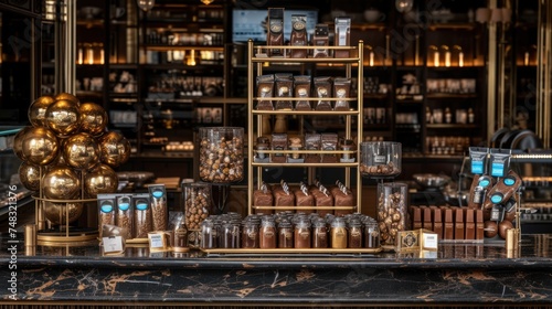 a display in a store filled with lots of different types of chocolates and confections on gold shelves.