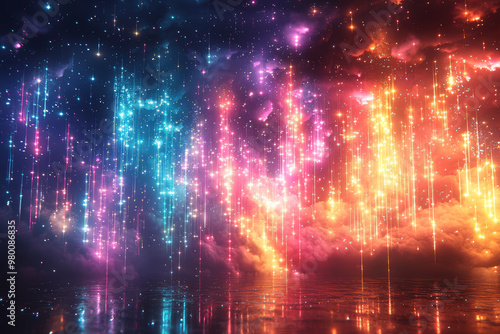 A display of colorful fireworks lighting up the night sky in brilliant, cascading patterns. Concept of celebration and visual impact.