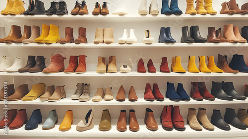 shoe, boot, fashion, display, colours, style, shelf, retail, collection, variety, design, accessory, footwear, trend, shopping, modern, casual attire, formal, chic, vibrant, aesthetic, arrangement, merchandise, product, showcase, presentation, elegance, comfort, quality, craftsmanship, seasonal, unique, minimal, trendy, classic, leather, material, selection, boutique, urban, lifestyle, clothes rack, outfit, attracted, choice, life events, ambience, decor