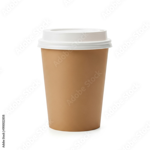 A disposable brown coffee cup with a white lid against a white background