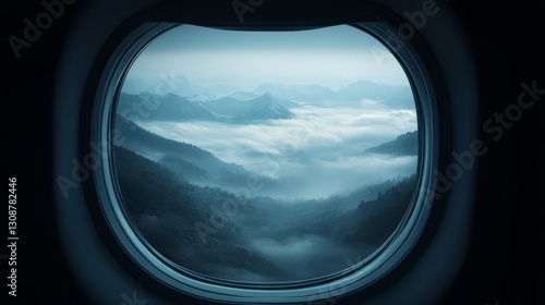 A distant mountain range shrouded in mist, seen through an aircraft window