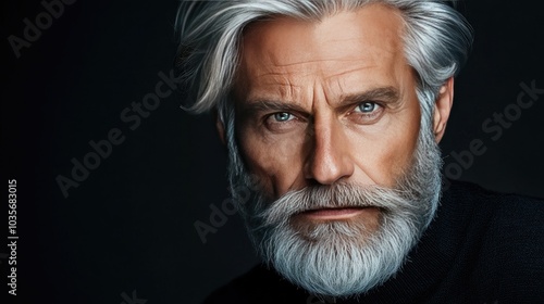 A distinguished elderly man with captivating blue eyes, silver hair, and a white beard gazes with intensity, set against a dark background, exuding wisdom and depth.