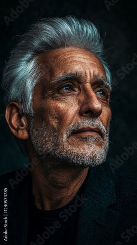mature, man, silver, hair, beard, thoughtful, expression, wisdom, contemplative, indoor, lighting, portrait, depth, emotion, gaze, shadow, rich, life, character, life events, elegance, solitude, ageing, photogenic, serious, thinking, moody, dark, background, line, dignity, calmness, personality, story, fierce, eye, introspection, beauty, mystique, calmness, artful, serene, atmospheric, intellectual, natural, aged, feature, inner