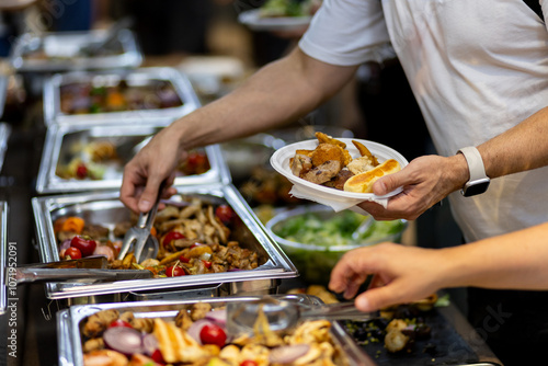buffet, food, dinner, meal, lunch, variety, dish, grilled, meat, vegetable, eatery, salad, gathering, casual attire, serving, appetiser, side, selfservice, tongs, celebration, dining, hotel, community, event, plate, catering, cookery, chicken, beef, pork meat, fresh, salad, banquet, fork, favor, sharing, assortment, culinary, enjoyment, men at work, festive, communal, social, hospitality, tasty, table, delicious, life events