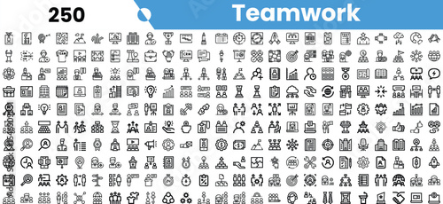 A diverse collection of teamwork icons depicting collaboration, communication, and success in various professional settings.