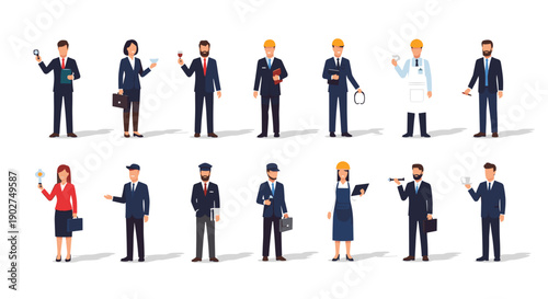 A diverse group of business professionals standing in various poses on a