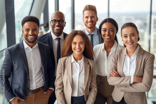 A diverse group of businesspeople poses for a professional team photo, exuding confidence and professionalism, while looking smart and impeccable. Generative AI.
