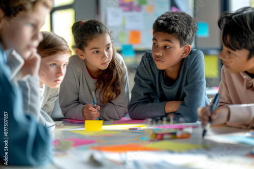 A diverse group of children collaborating on a school project, discussing and brainstorming ideas in a bright and engaging classroom.