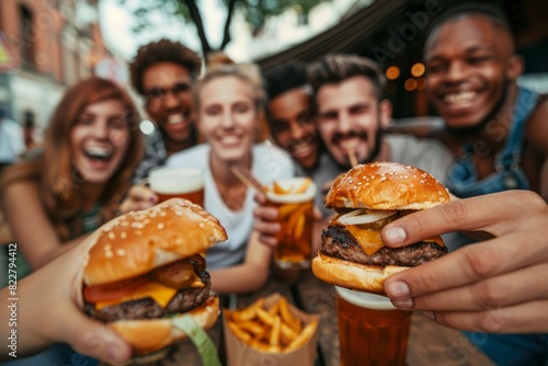 A diverse group of friends dine at an outdoor cafe, enjoying burgers and drinking beer together.