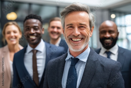 A diverse group of smiling business professionals stand together, exuding confidence and teamwork in a modern setting.