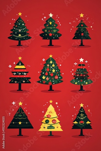 A diverse set of Christmas tree icons in flat design style with festive decorations, stars, and ornaments on a red background