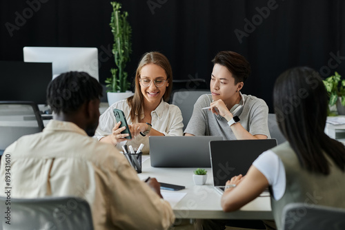 A diverse team of young professionals collaborates on a project, focused on a smartphone.