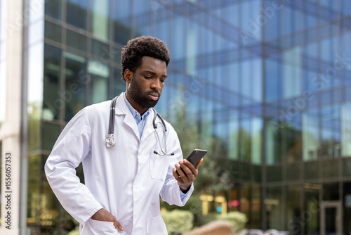 doctor, physician, medicals, health care, phone, smartphone, mobile, technology, communication, texting, online, appointment, consultation, clinic, person, male, businessman, black man, employee, entrepreneur, staff, people, men at work, hospital, architecture, urban, outdoors, man, adult, african, afro, coat, white, stethoscope, professional, electronic mail, app, screen, touch, reading, searching, information, patient, diagnosis, treatment, wellness, well-being, serious, concentrating, outside