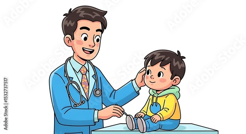 doctor, children, exam, ear, paediatrician, health care, medicals, check-up, clinic, patient, illustration, cartoon, children, boy, smiling, stethoscope, health, medicine, treatment, well-being, consultation, happy, cute, young, exam, healthy, pediatric, professional, care, cheerful, positive, wellness, visit, office, appointment, consult, listening, diagnose, check, sick, disease, hospital, anatomy, therapy, body