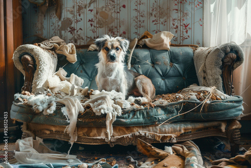 dog, couch, sofa, furniture, mess, sitting, destroyed, damaged, torn, fluffy, domestic, animal, pet, playful, adorable, cute, brown, white, paw, fur, tail, eye, mouth, teeth, home, indoor, house, living, room, carpet, rug, window, light, vintage, retro, old, classic, interior, design, style