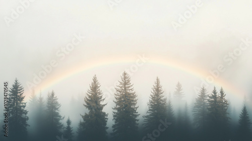 A double rainbow arching over a misty forest after a summer storm photo