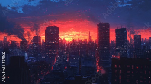 A dramatic cityscape at dusk, with high-rise buildings illuminated by the sunset and the sky transitioning from orange to deep blue.