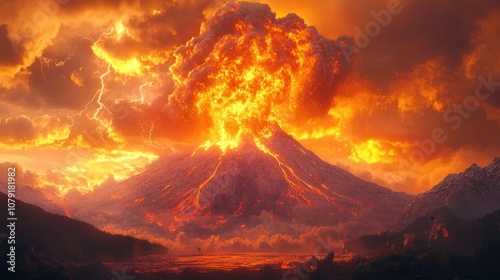 A dramatic, fiery volcanic eruption with lightning striking a dramatic, orange sky.