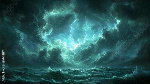 storm, cloud, ocean, water, wave, lightning, sky, thunder, dramatic, turbulent, darkness, light, aethereal, glow, dark, teal, moody, tempest, coastal, sea, nature, powerful, electrical, weather, energy, atmosphere, ominous, wild, scenic, seascape, horizon, foam, surge, wind, rain, nebulous, vapour, vibrant, electric, artistic, digital, illustration, background, design, visual, abstract