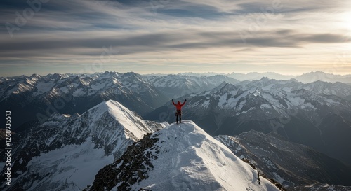 A dramatic scene of a climber in a red jacket standing triumphantly on the summit of a snow covered mountain peak