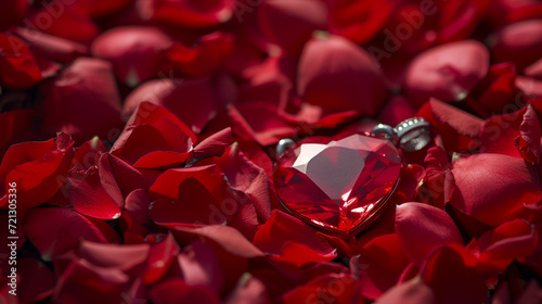 A dramatic shot of a heart-shaped pendant nestled in a bed of rose petals, creating a visually captivating scene symbolizing love and devotion