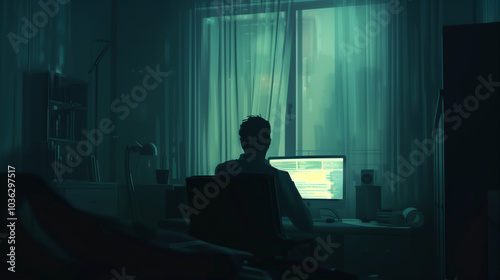 A dramatic silhouette of a person working on a desktop computer in a dimly lit room, creating a moody atmosphere, often associated with technology, coding, or hacking